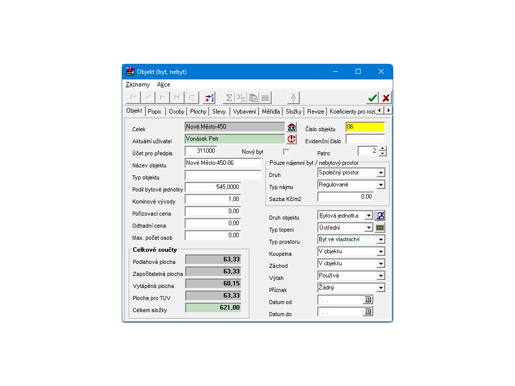 Evidence bytů a nebytů: pasport bytu, evidence osob (uživatelé, vlastníci, spolubydlící včetně vztahu k uživateli bytu), evidence ploch (místností) s mnoha parametry nutnými pro vyúčtování, evidence slev, evidence vybavení bytu, evidence složek plateb za užívání bytu s volbou typu rozúčtování zálohové platby, evidence měřidel a odečtů s možností výpočtu koeficientu mezi patním (fakturačním) měřidlem a bytovými měřidly, plánování a evidence revizí, automatický výpočet složek plateb (Kč, koeficient, osoby, plocha,…). Tisk pasportu a evidenčního listu, nájemní smlouvy a řady dalších přehledů. Zadávání je řešeno tak, aby se jeden údaj nemusel zadávat dvakrát.